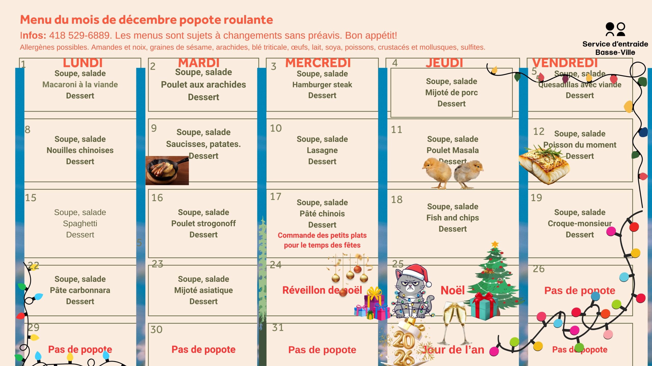 La cuisine a pour mission de mettre un peu de bonheur dans l’assiette en fournissant des repas copieux et savoureux pour seulement 2 $ les midis, du lundi au vendredi, pour les bénévoles qui viennent donner de leur temps généreusement au SEBV. Des collations sont aussi données gratuitement pour les pauses des bénévoles.